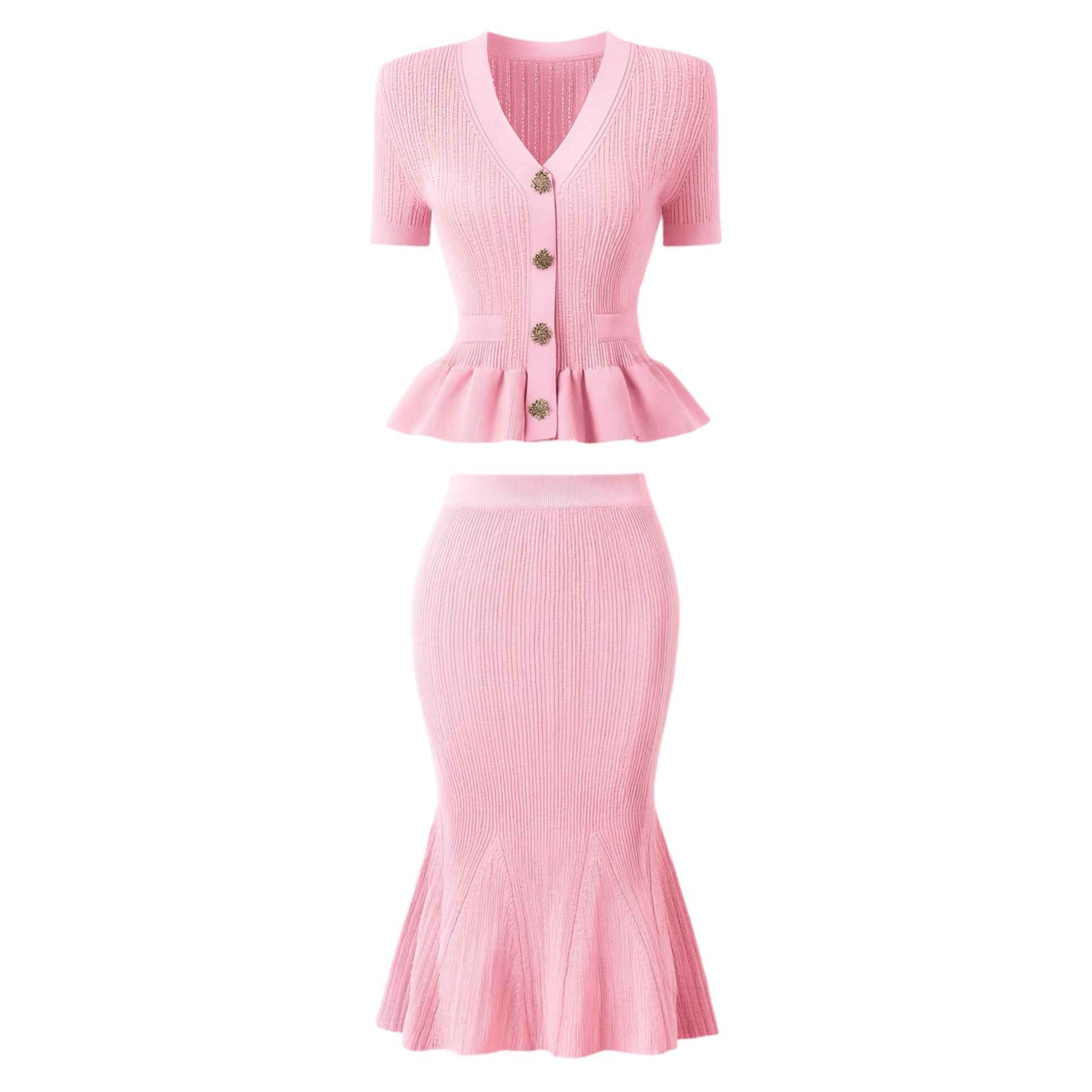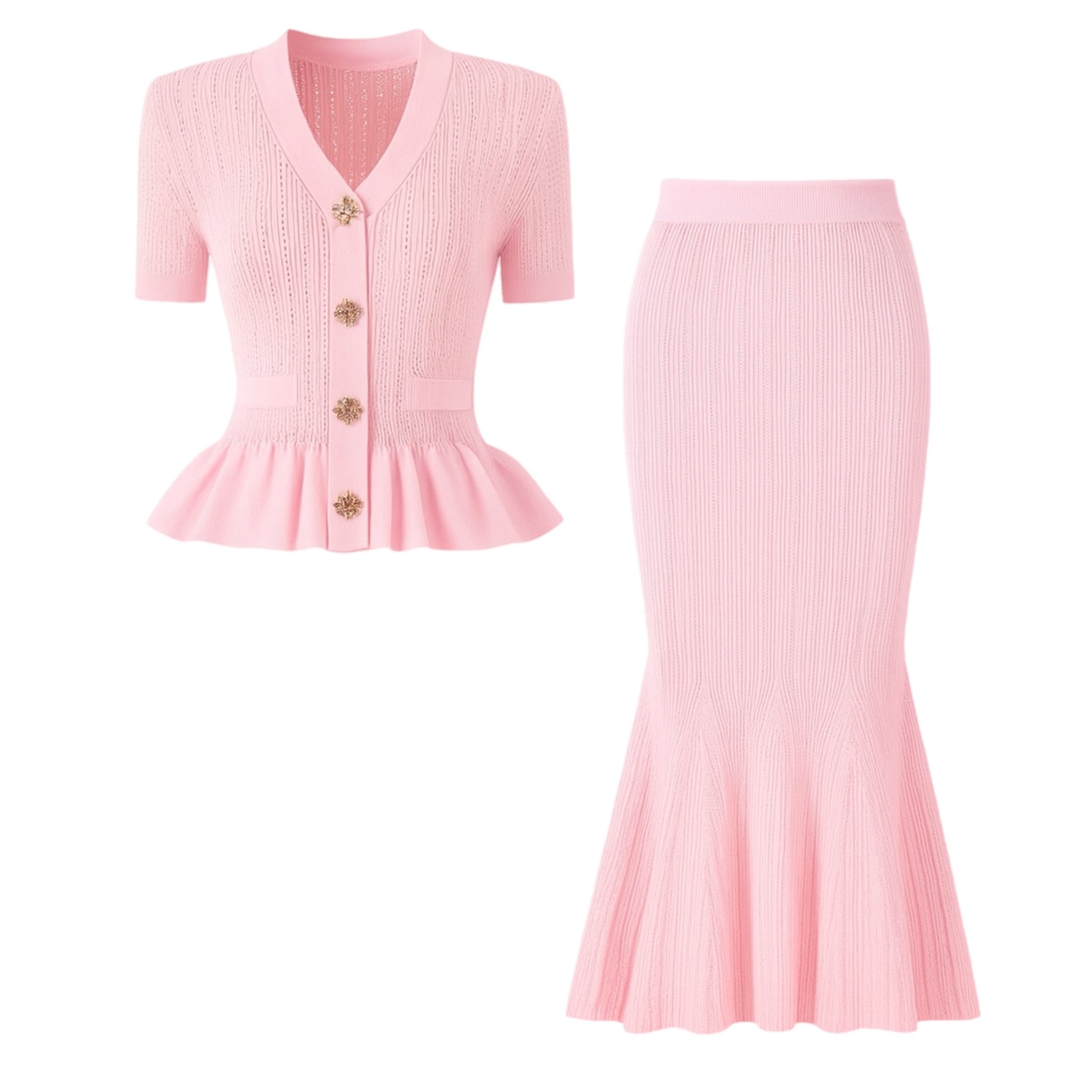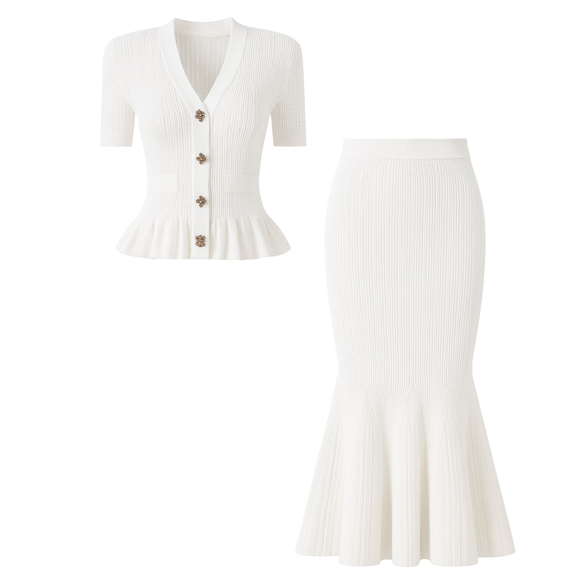 Adoptez l’allure chic et raffinée avec cet ensemble deux pièces en maille tricotée. Composé d’un cardigan manches courtes à boutons bijoux et d’une jupe longue sirène qui épouse la silhouette, il combine élégance et confort pour un look tendance.
