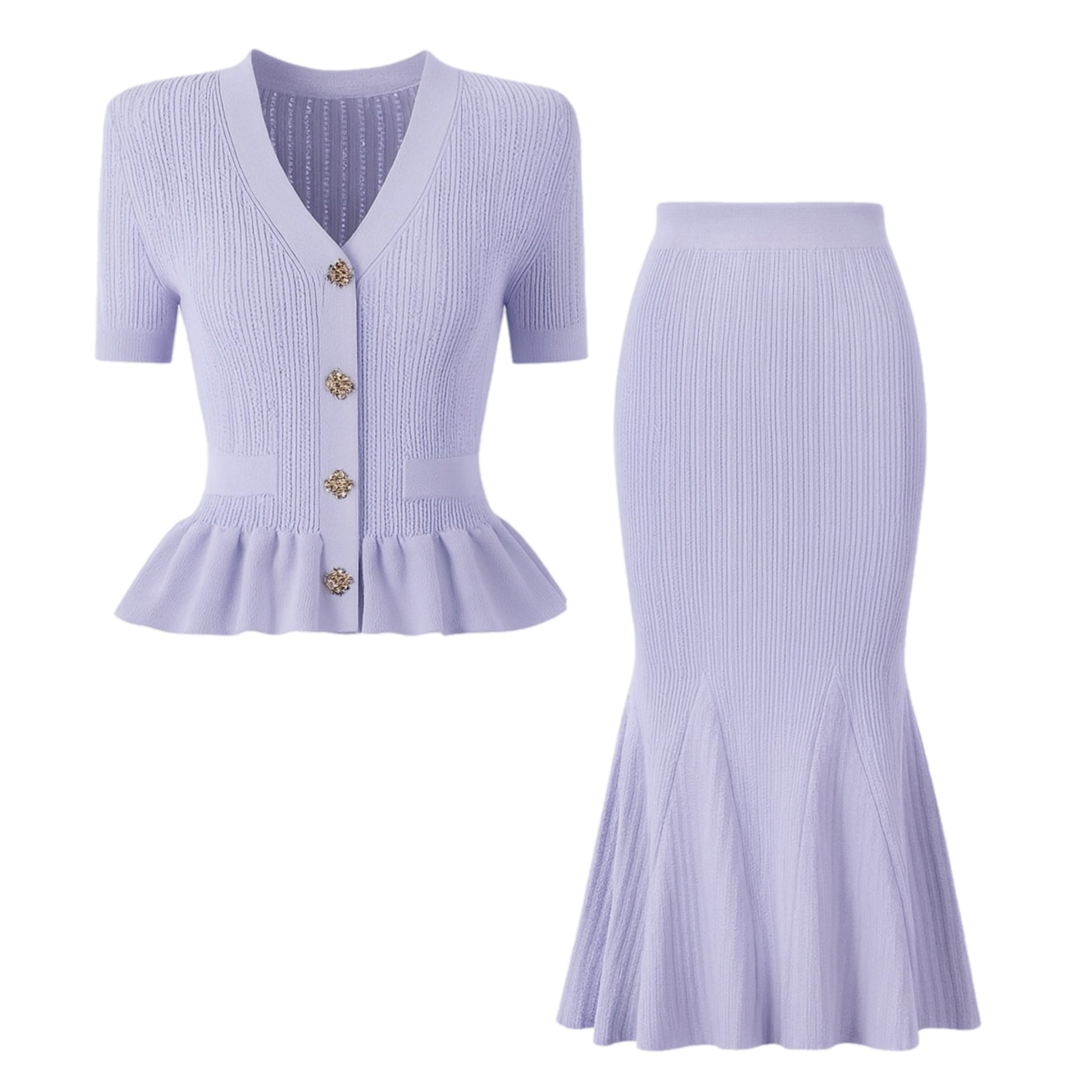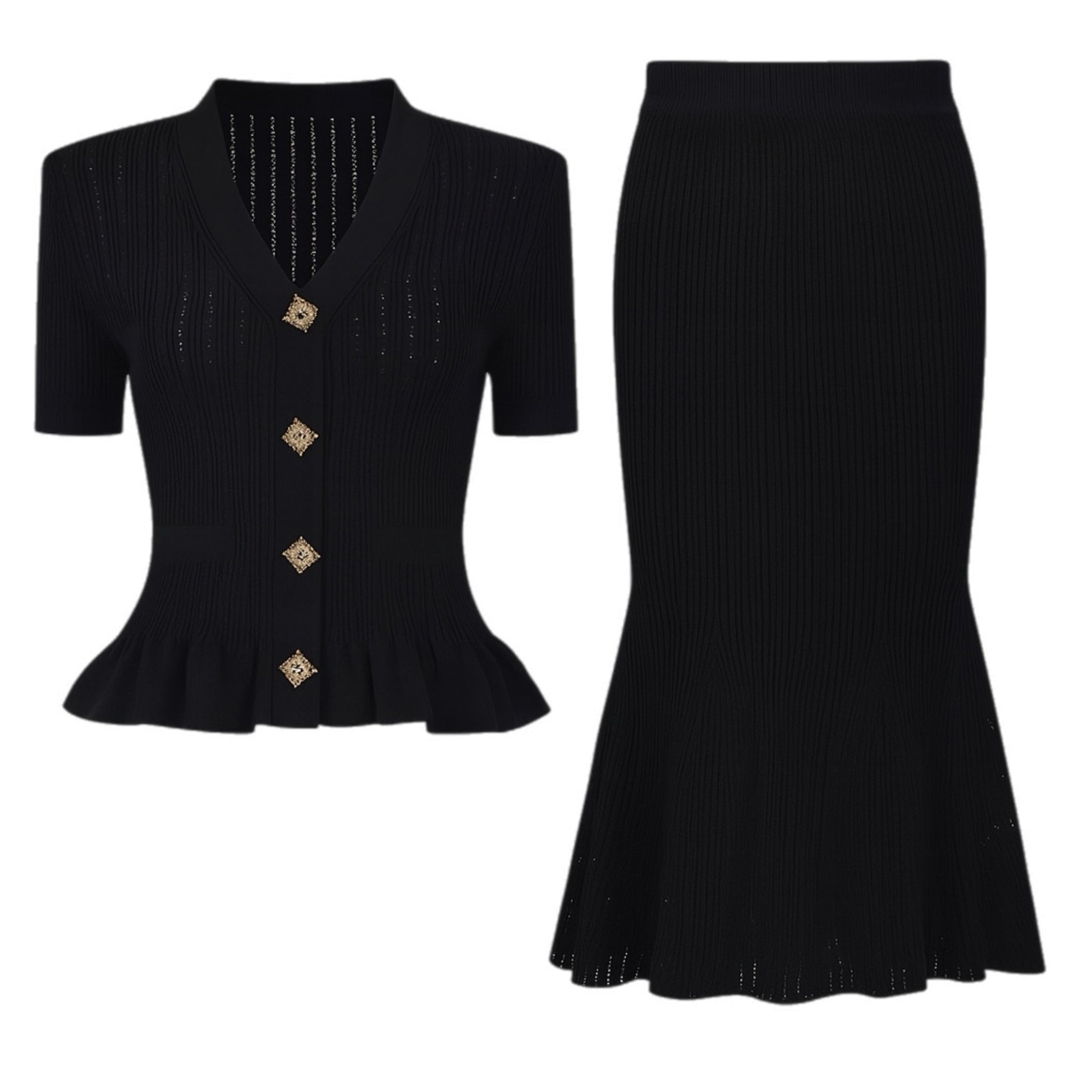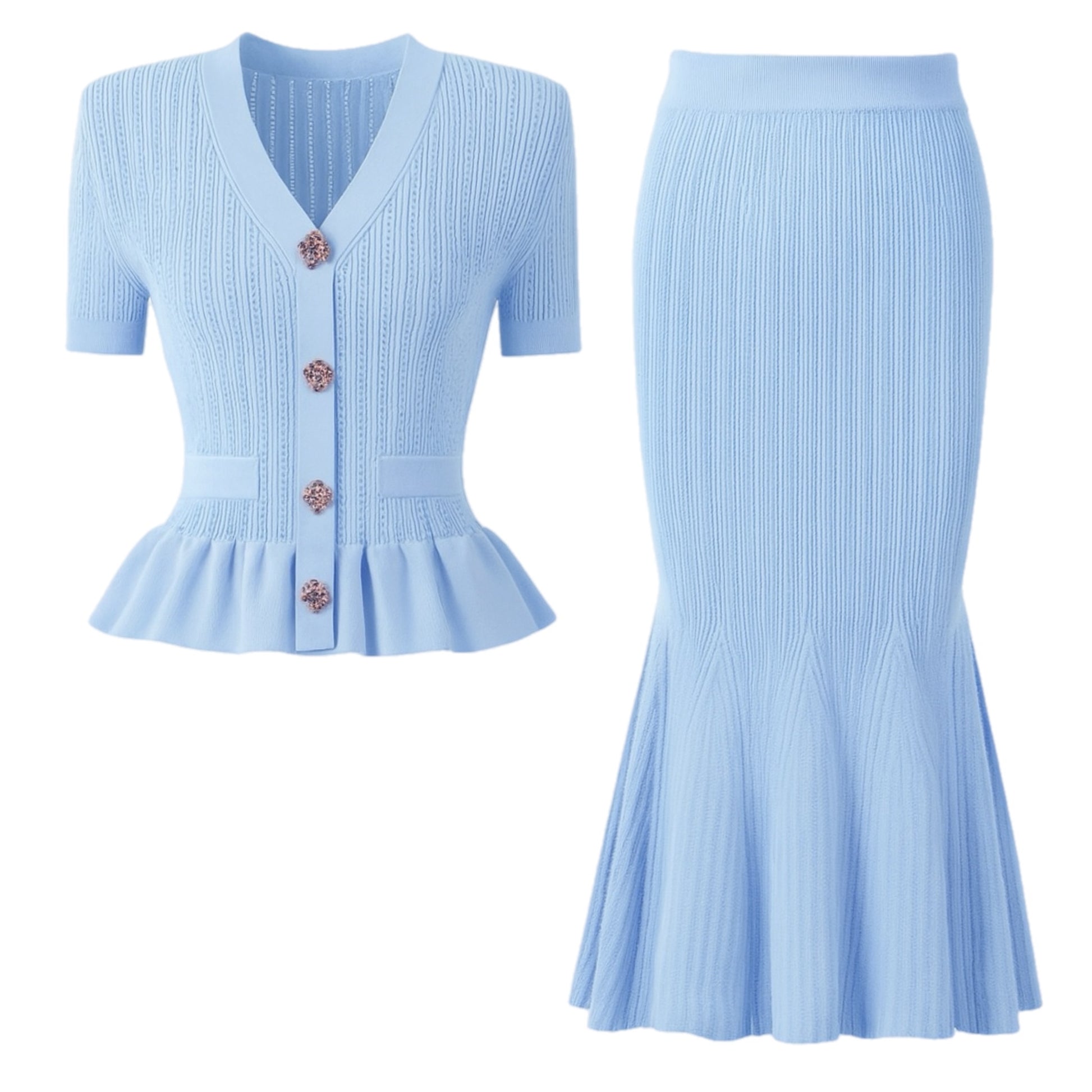 Adoptez l’allure chic et raffinée avec cet ensemble deux pièces en maille tricotée. Composé d’un cardigan manches courtes à boutons bijoux et d’une jupe longue sirène qui épouse la silhouette, il combine élégance et confort pour un look tendance.