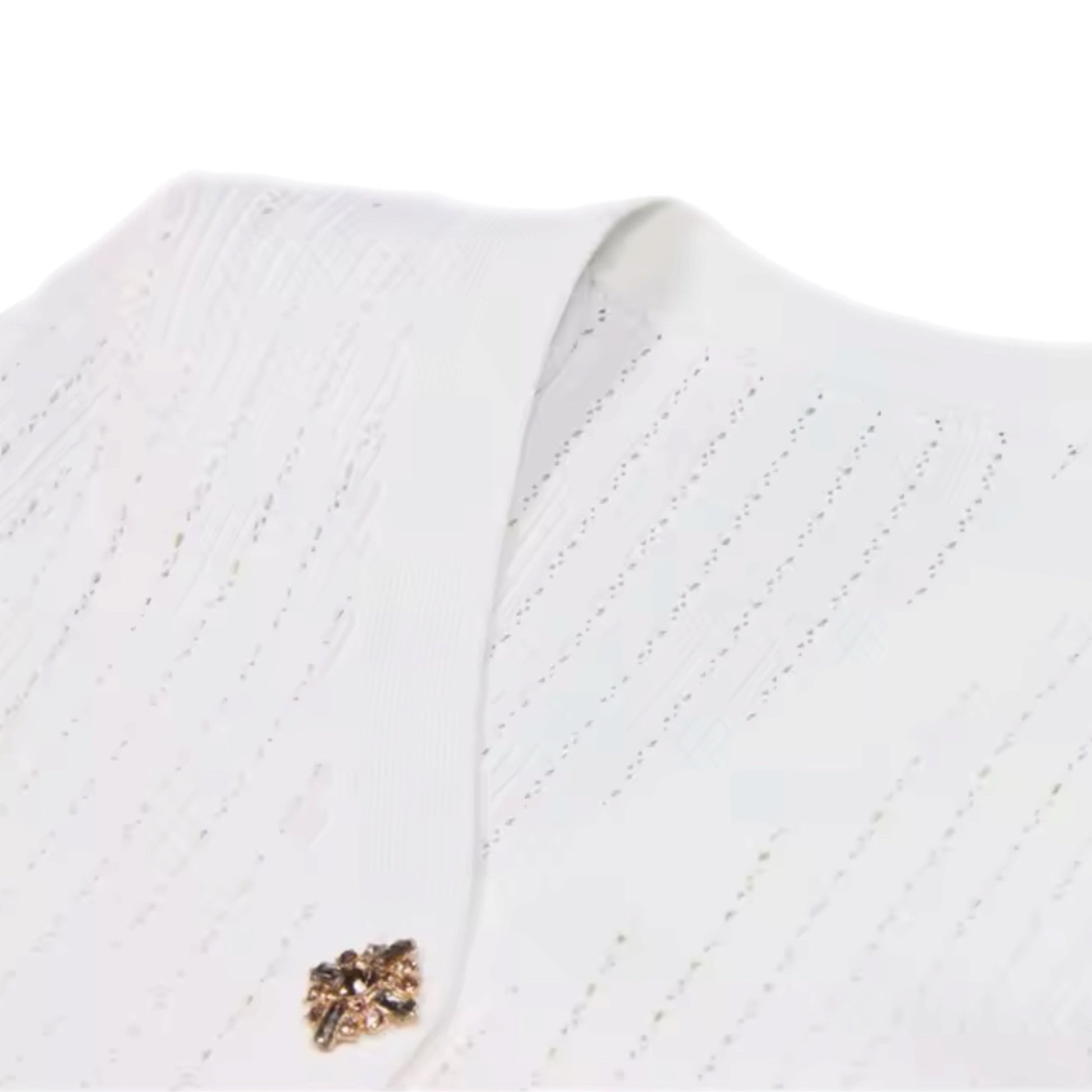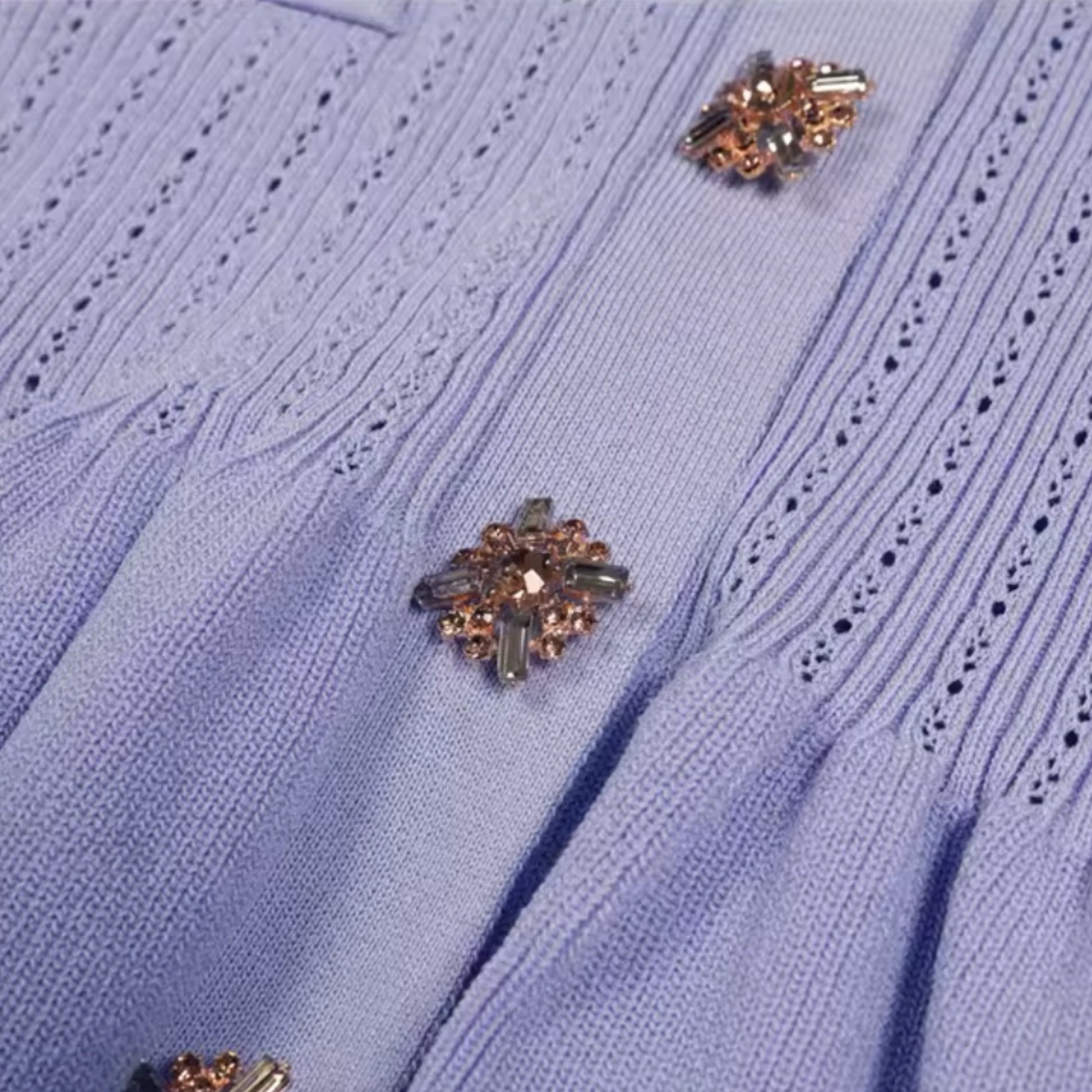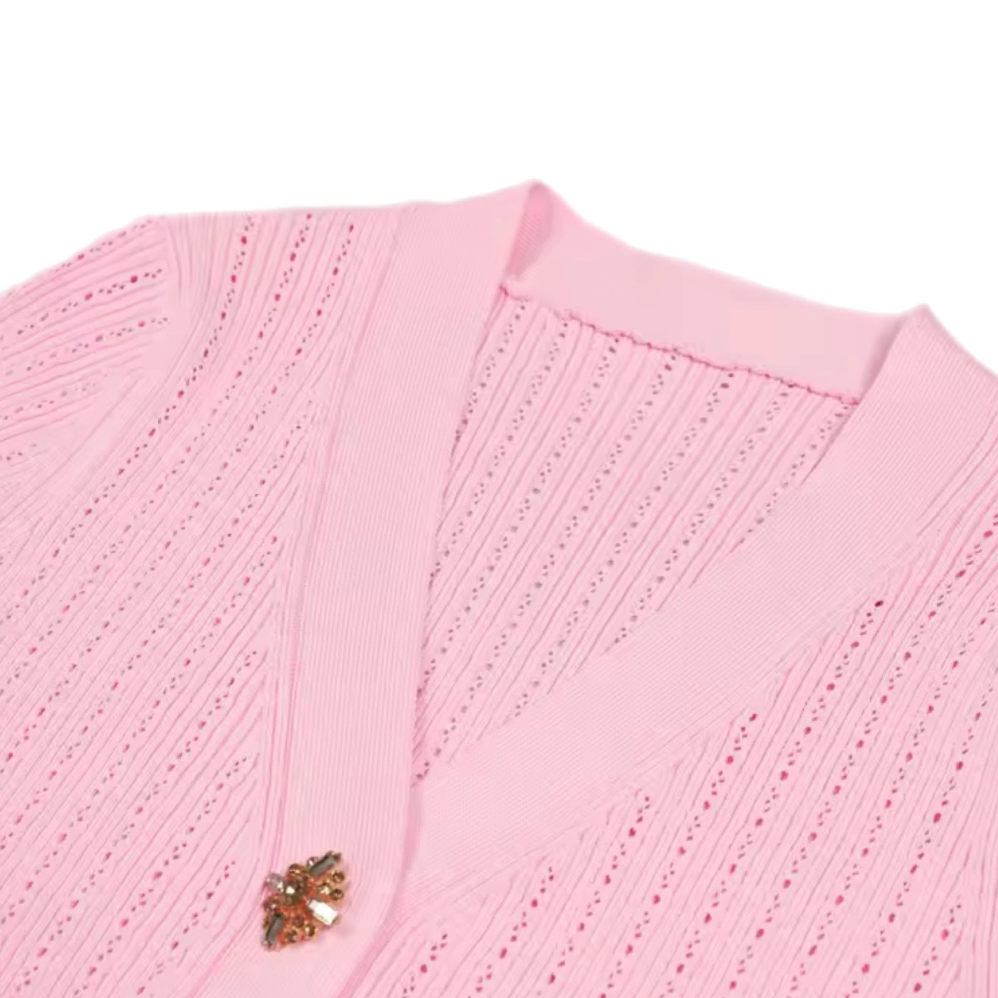- Haut cardigan : col en V, manches courtes, boutons décoratifs scintillants