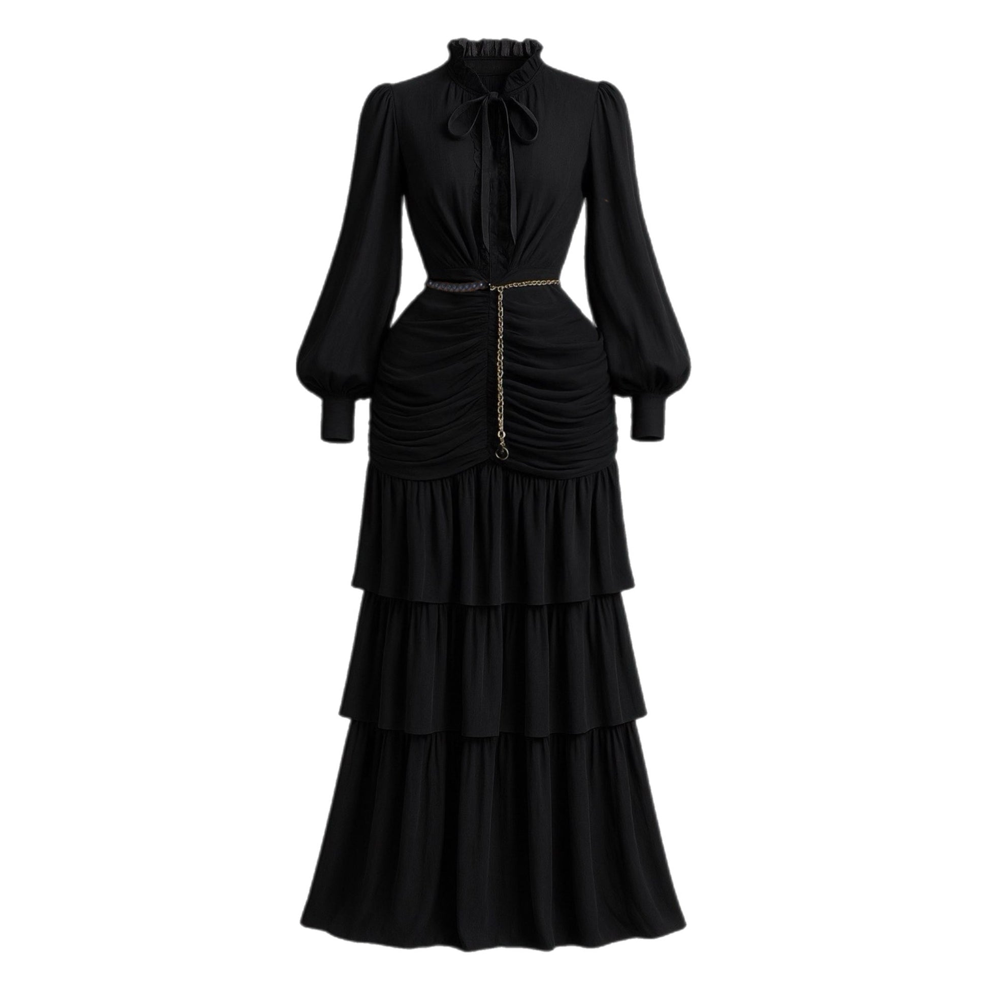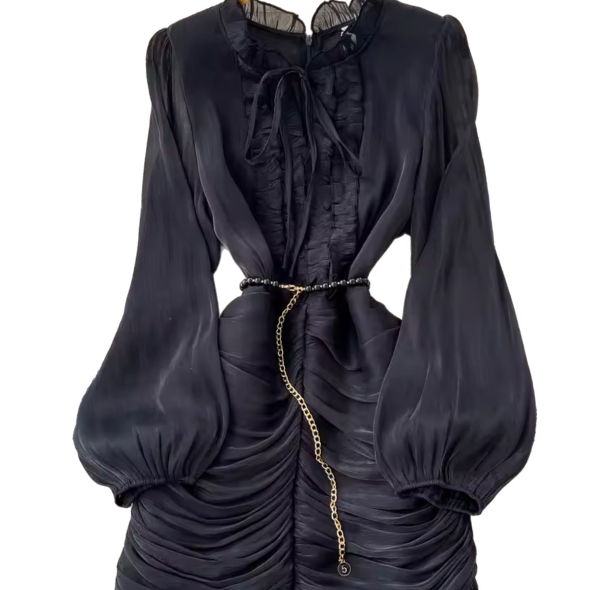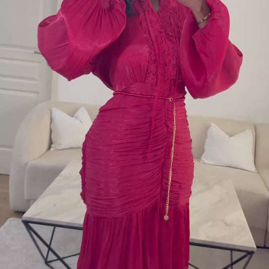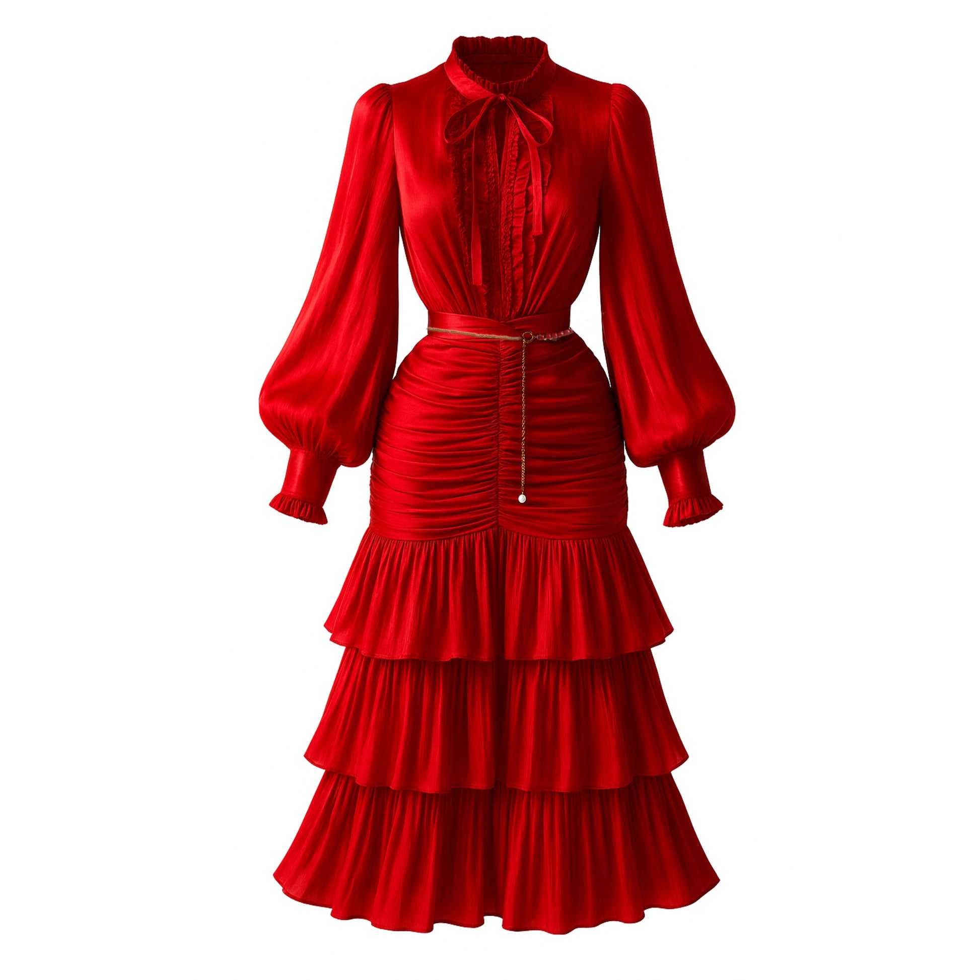 Apportez une touche de glamour à vos soirées avec cette robe longue sirène en satin fluide . Ses volants superposés, ses manches longues bouffantes et sa coupe queue de poisson mettent en valeur la silhouette tout en offrant un style raffiné et tendance.