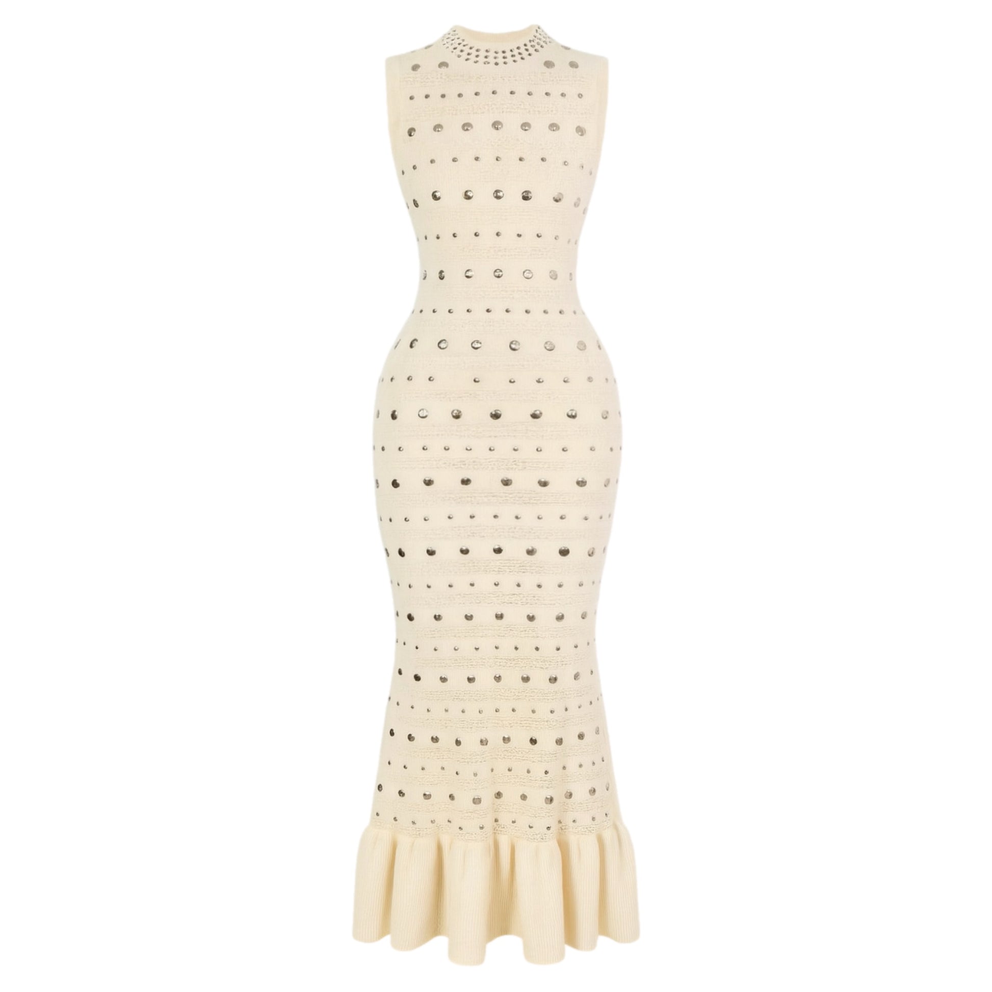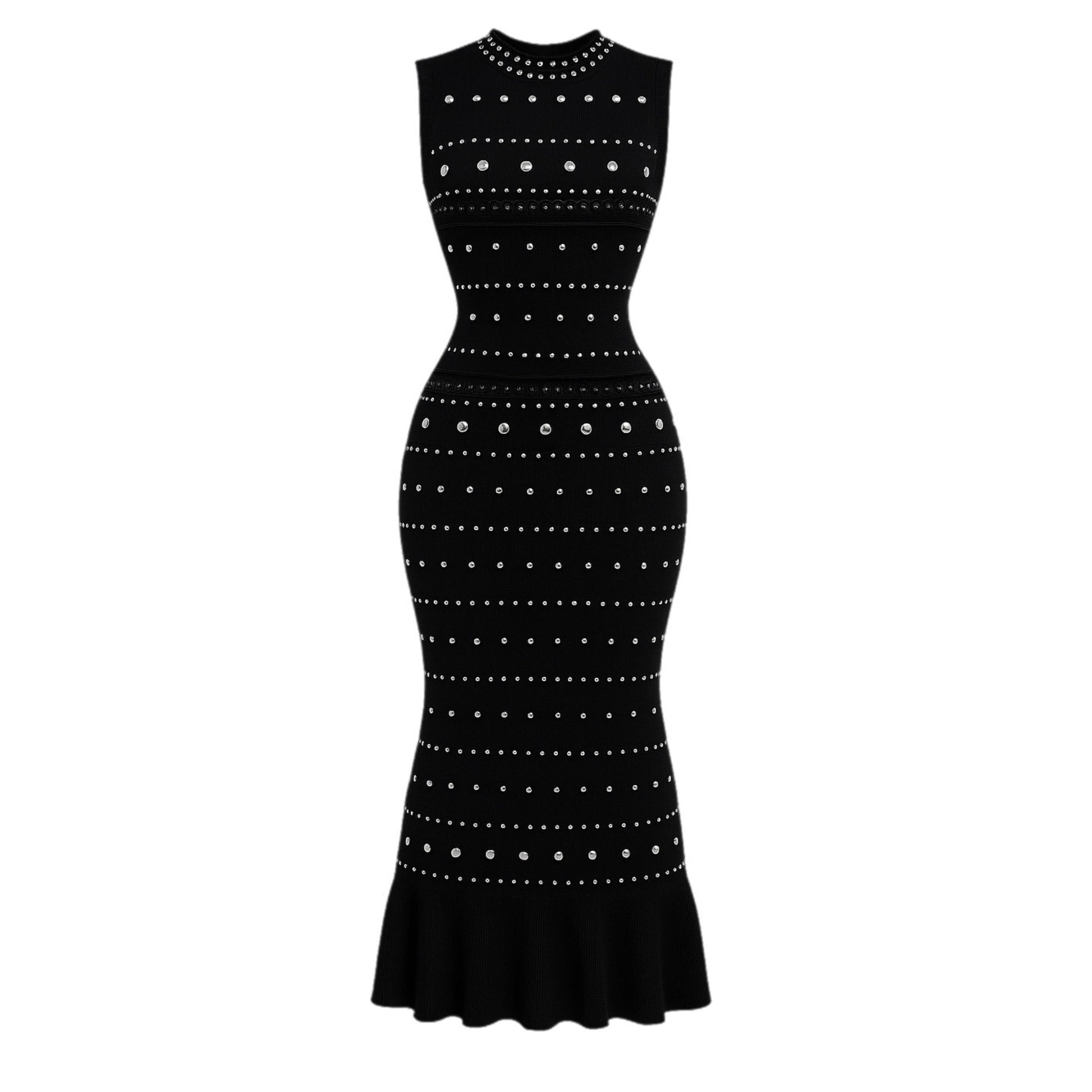 Cette robe longue noire sans manches se distingue par son tricot extensible raffiné et son décor de perles scintillantes. Sa coupe cintrée épouse la silhouette avec finesse tandis que l’encolure ronde structurée ajoute une touche sophistiquée. Un modèle idéal pour les grandes occasions et soirées habillées.