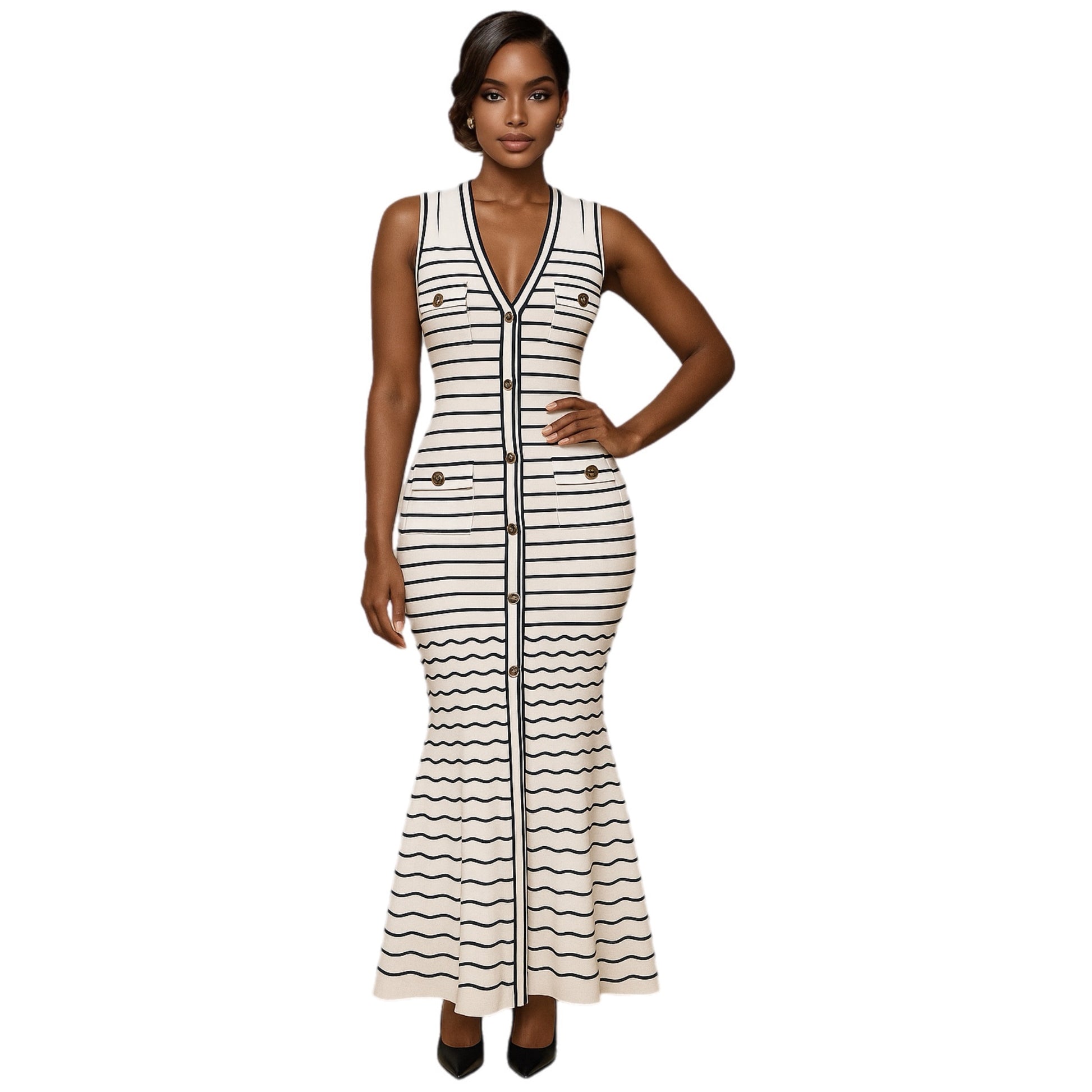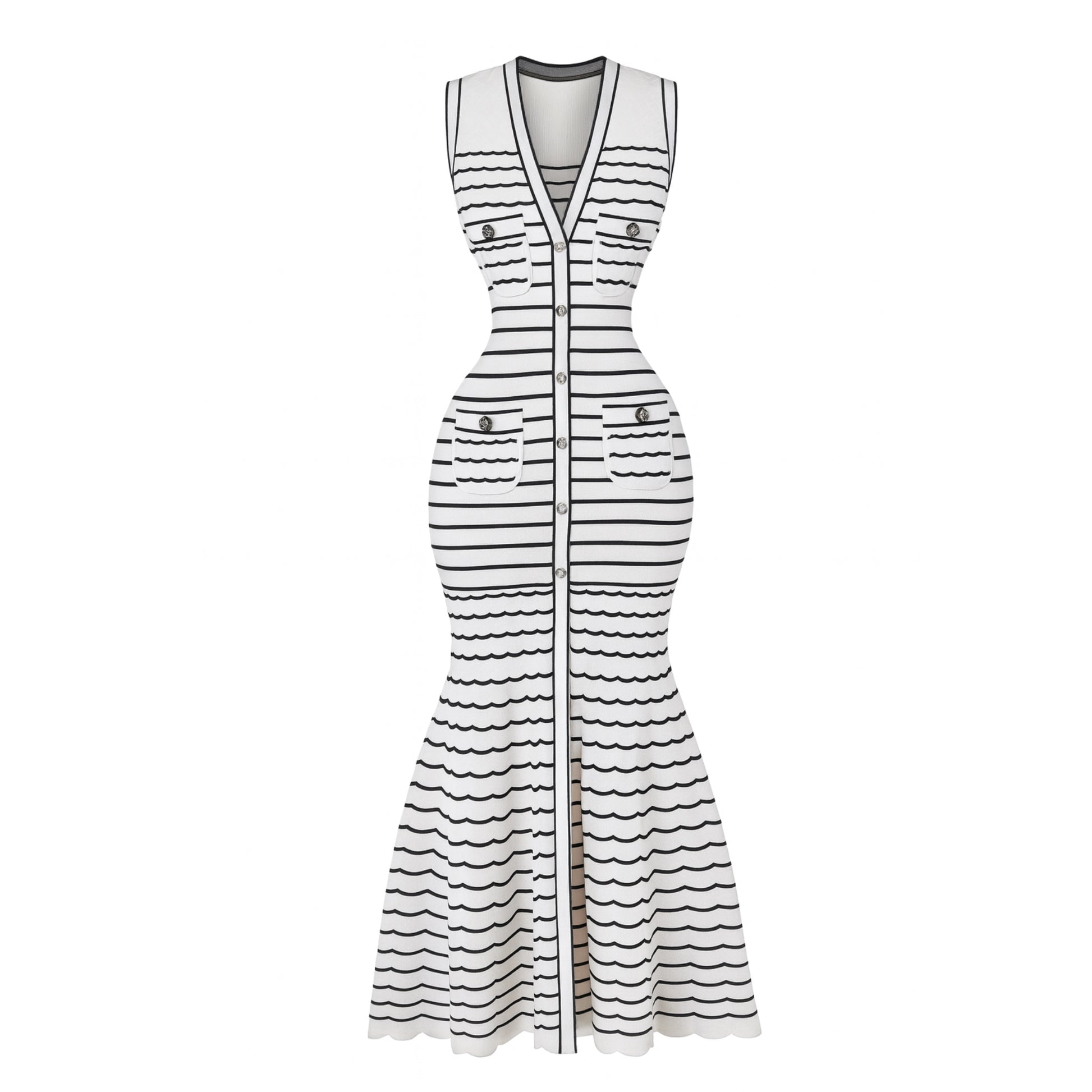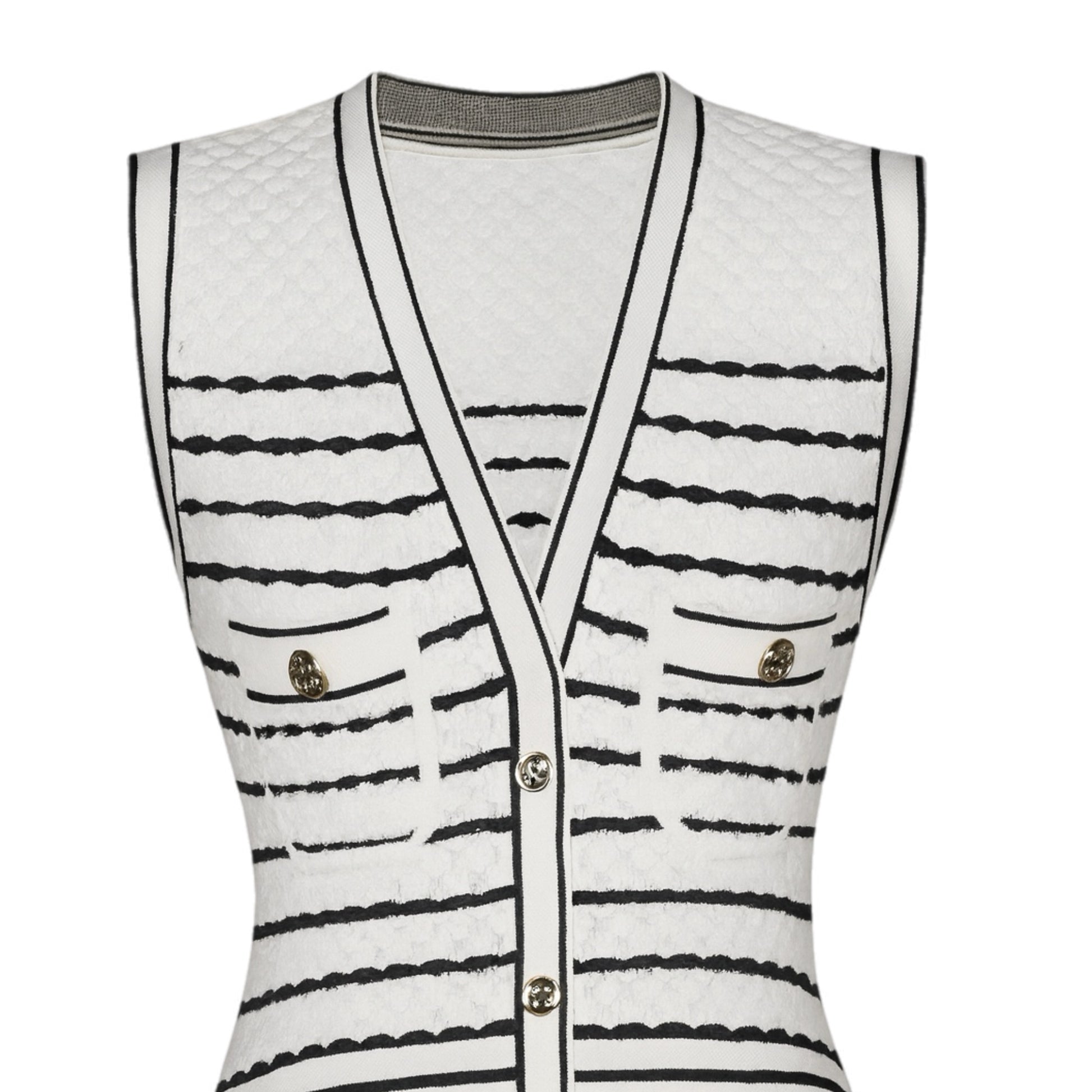 Affirmez votre style avec cette robe longue en maille tricotée à rayures graphiques noires et blanches . Sans manches et dotée d’un col V boutonné, elle combine confort et sophistication pour un look moderne et raffiné.