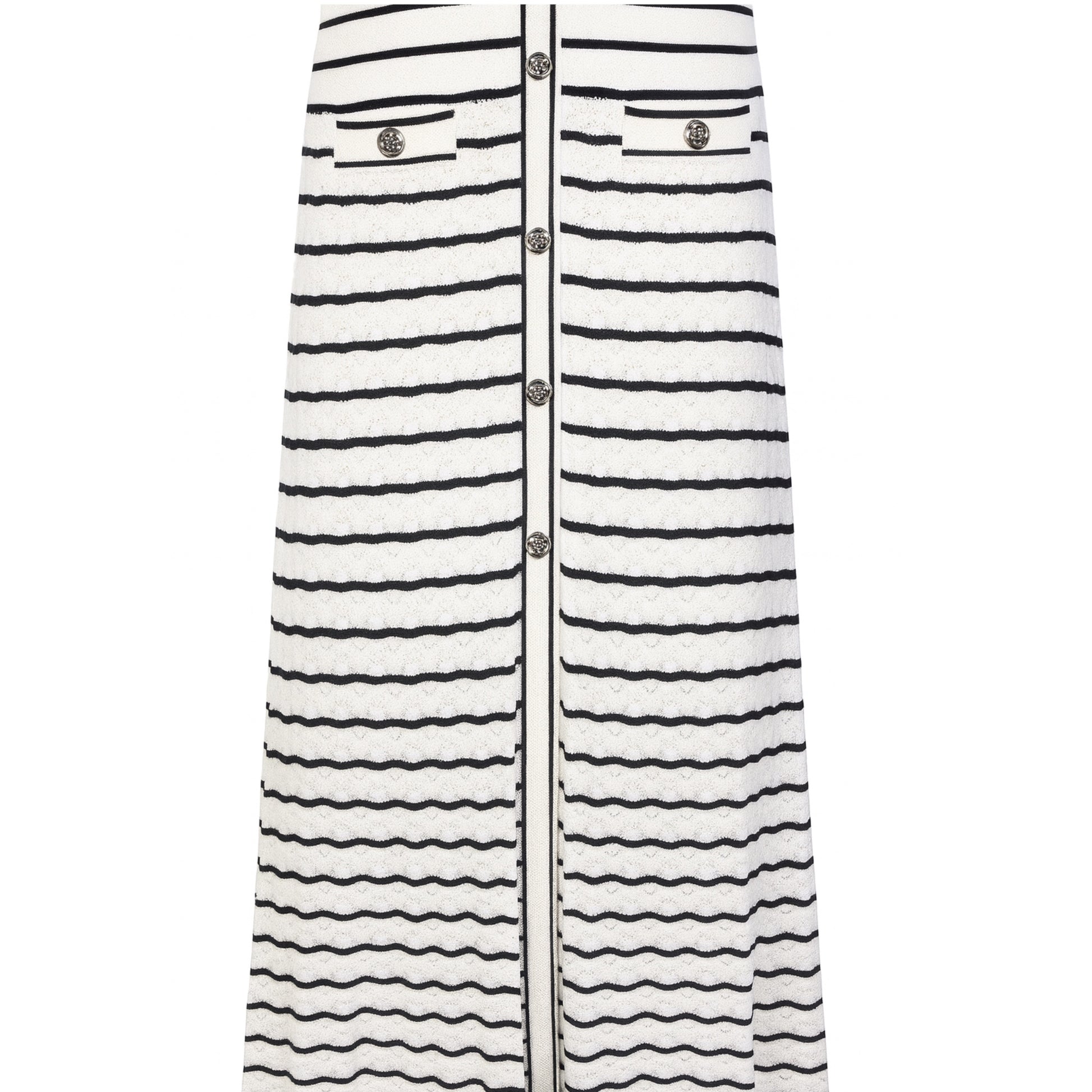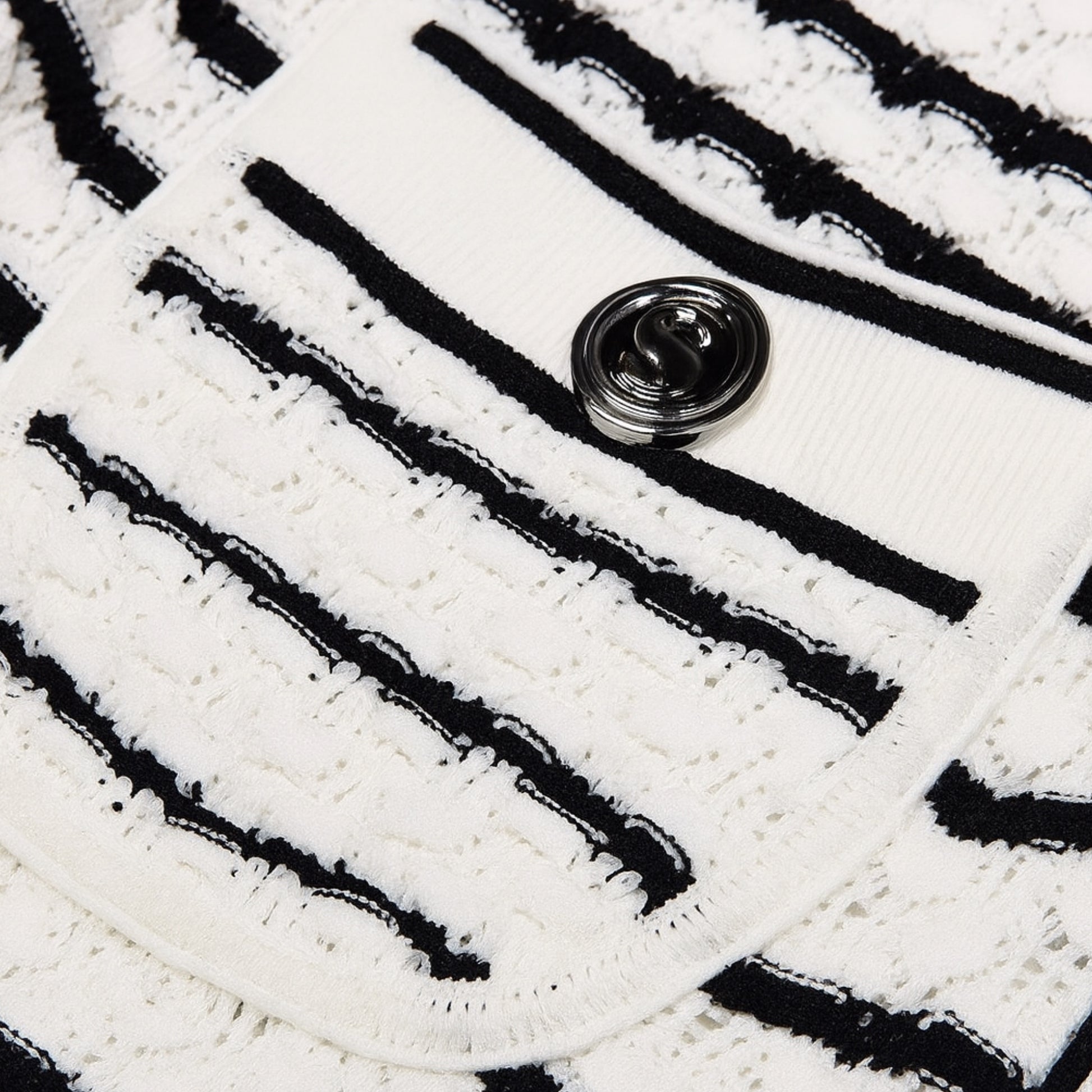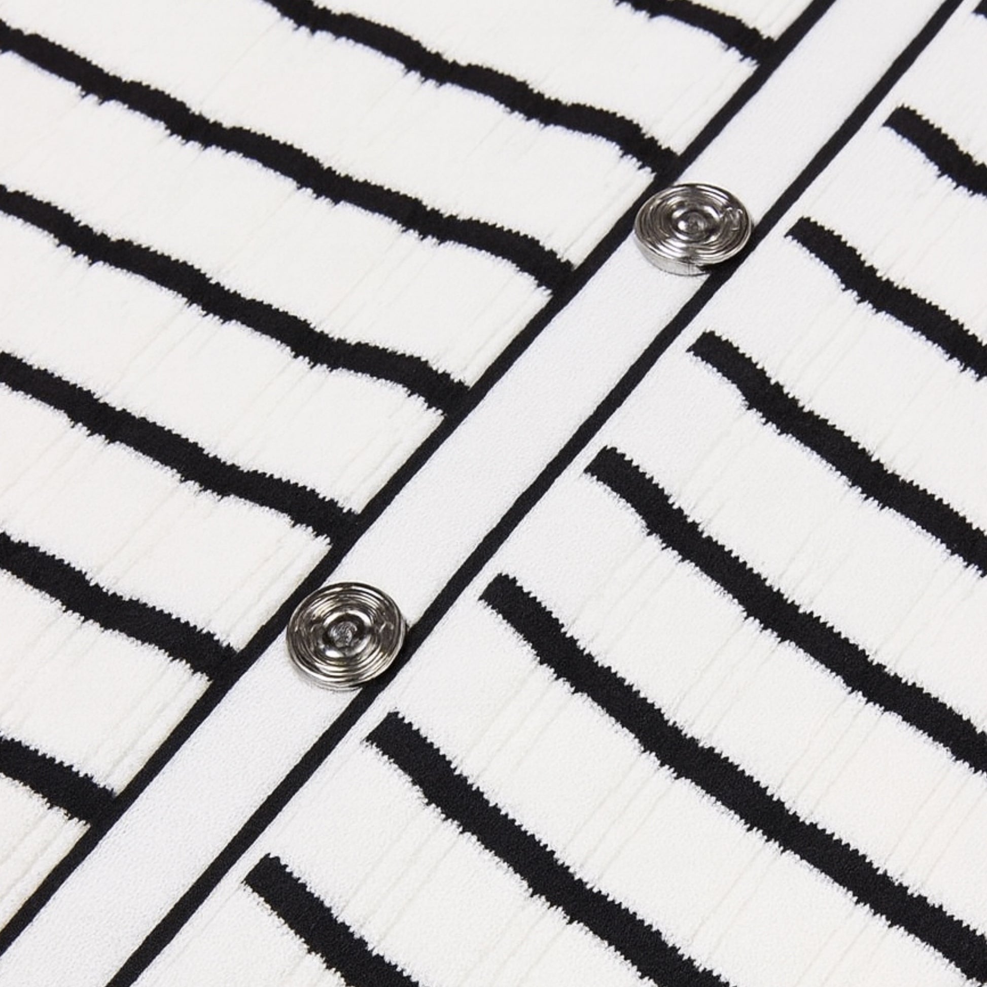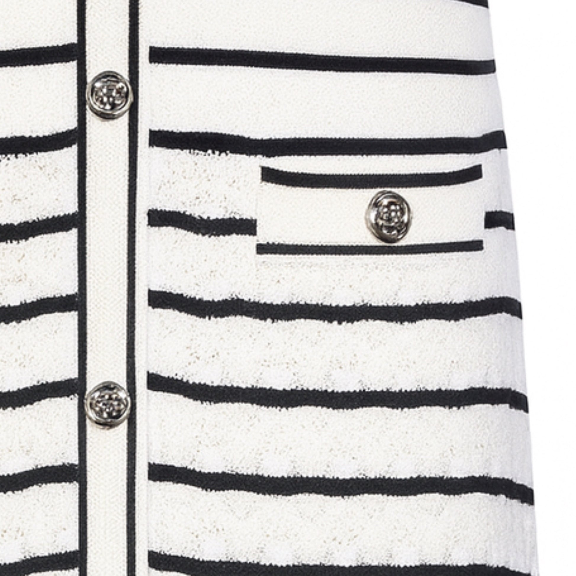 Affirmez votre style avec cette robe longue en maille tricotée à rayures graphiques noires et blanches . Sans manches et dotée d’un col V boutonné, elle combine confort et sophistication pour un look moderne et raffiné.