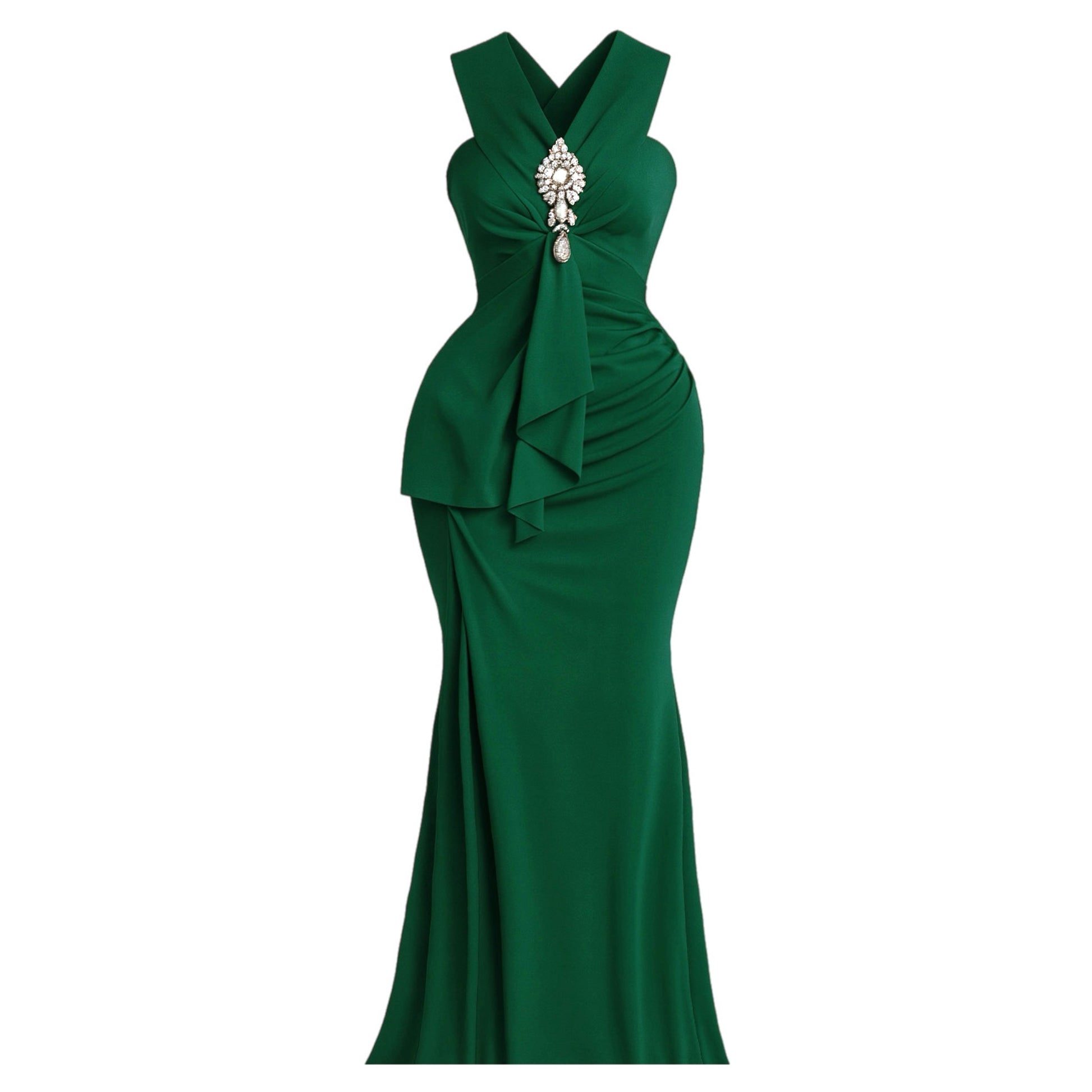 Sublime robe longue au style glamour et chic, idéale pour vos soirées, cocktails ou événements spéciaux. Sa coupe slim met en valeur la silhouette tandis que son design croisé et froncé à l’avant apporte une touche élégante et sophistiquée. Les détails en strass ajoutent un éclat luxueux.