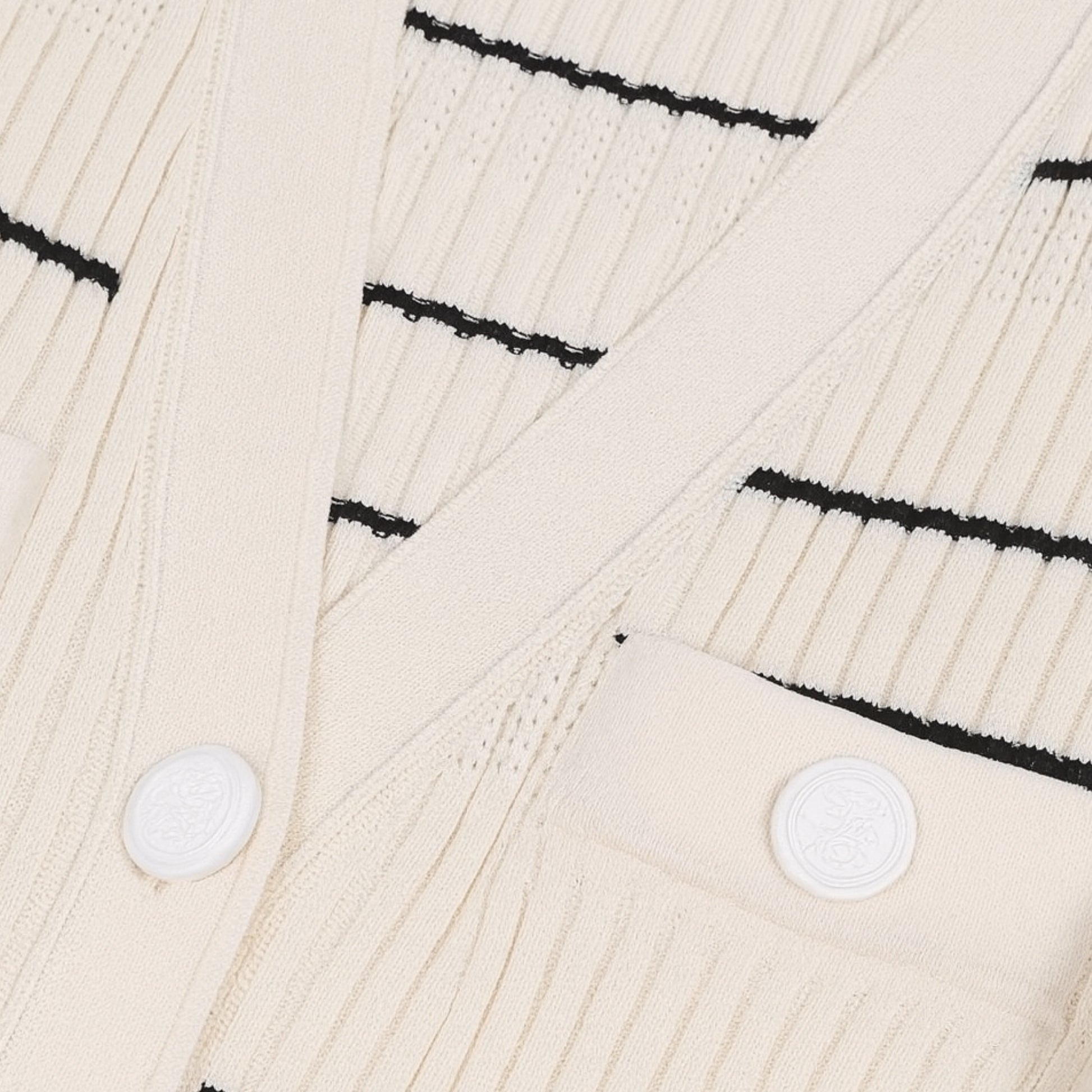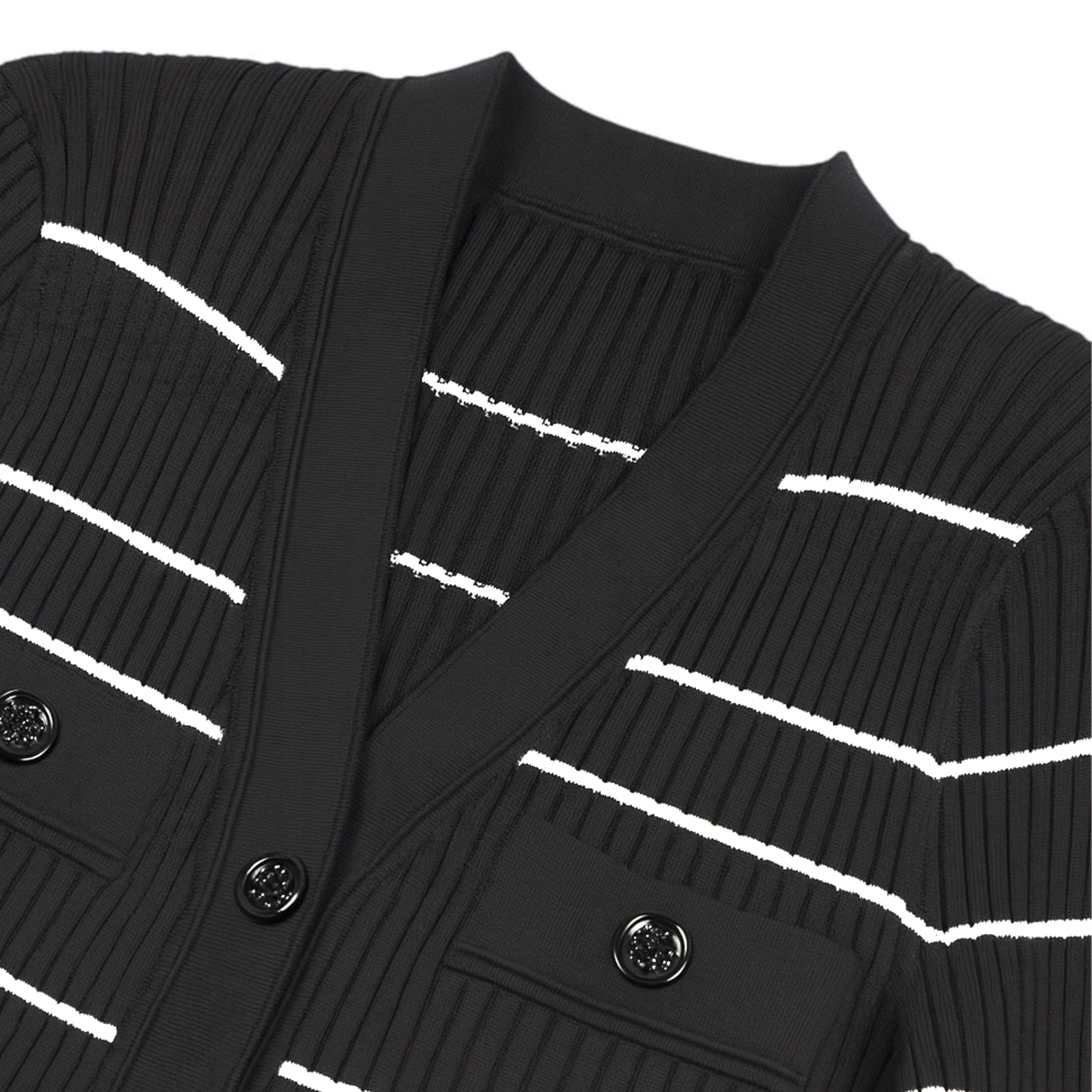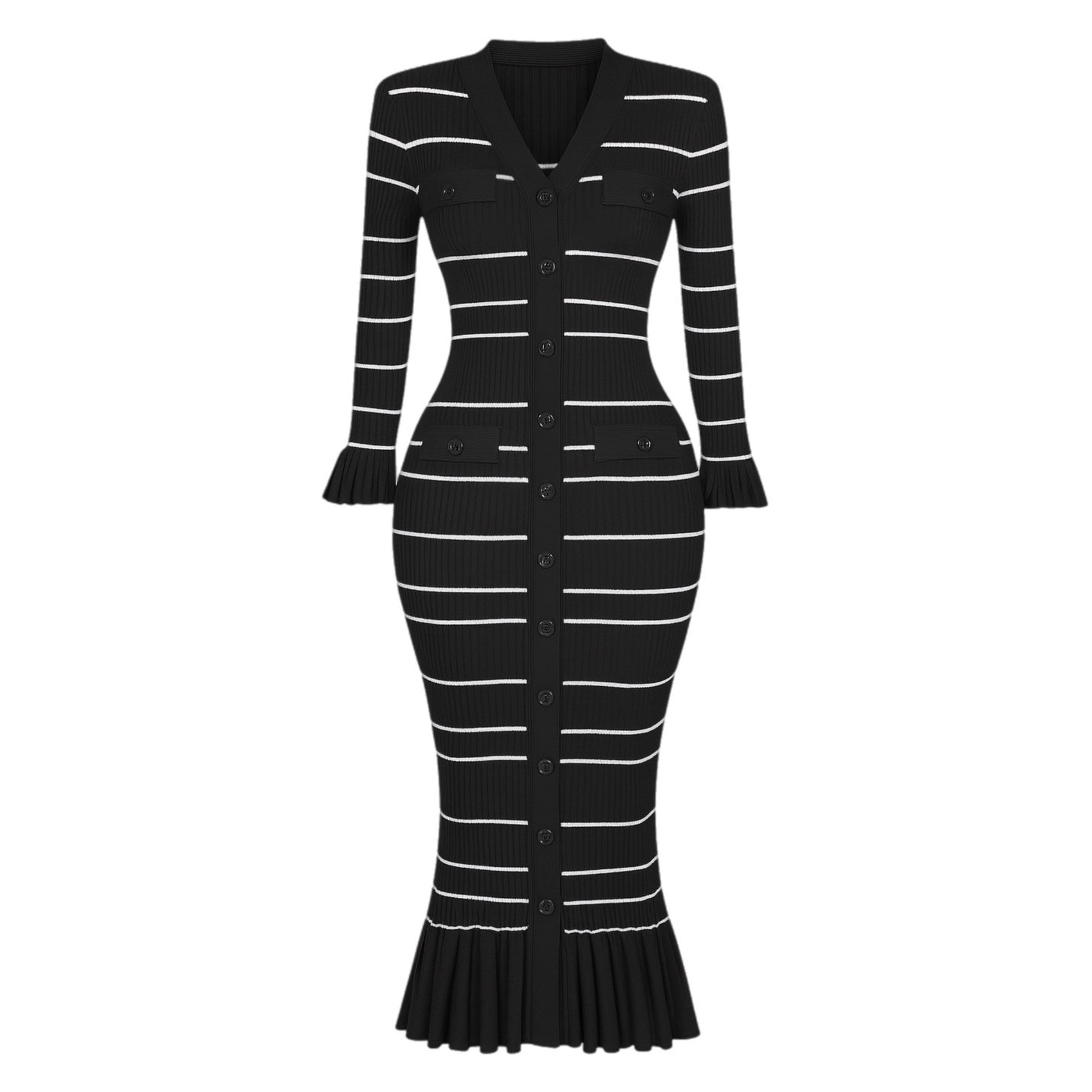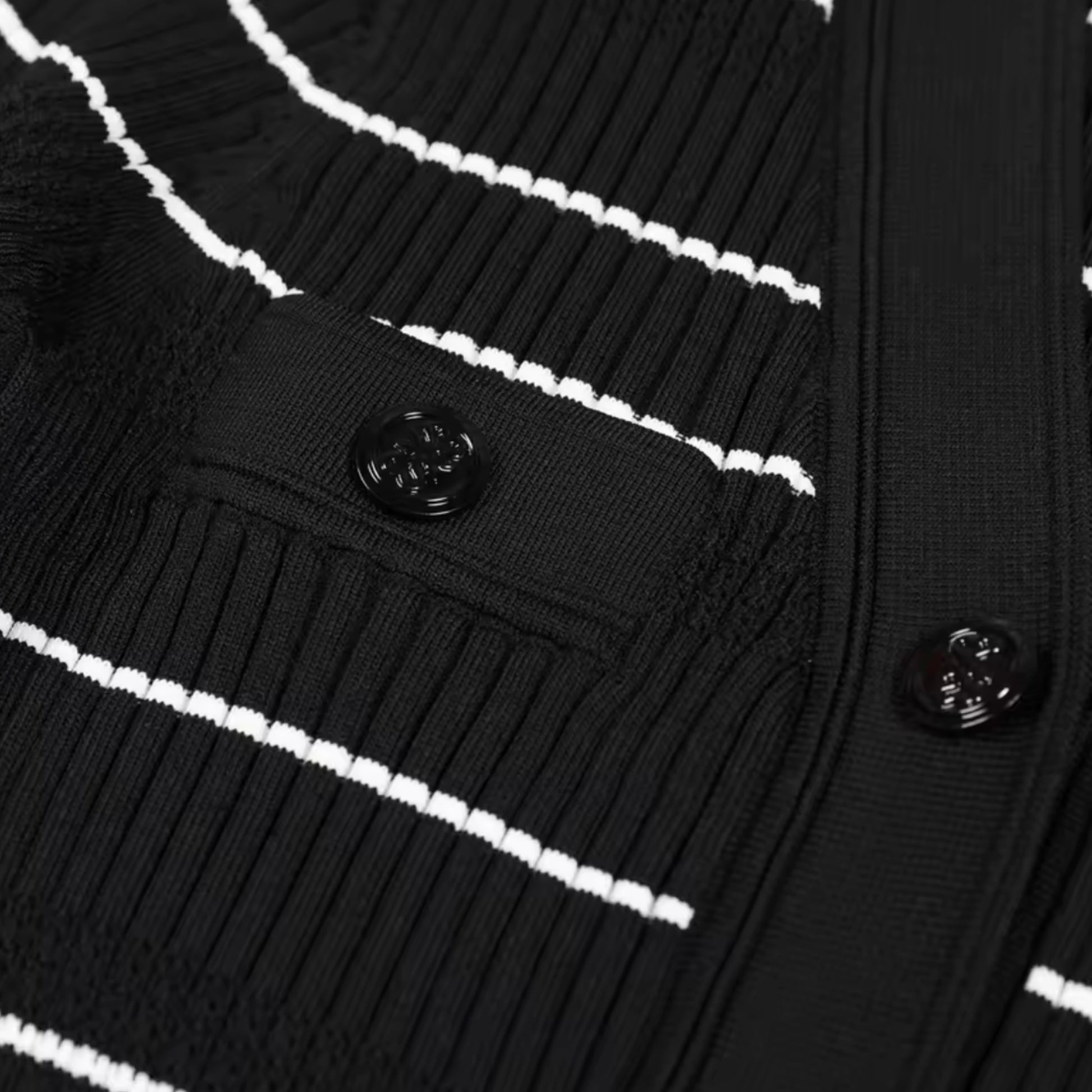 Affirmez votre style avec cette robe longue en maille tricotée à rayures graphiques noires et blanches. Sans manches et dotée d’un col V boutonné, elle combine confort et sophistication pour un look moderne et raffiné.