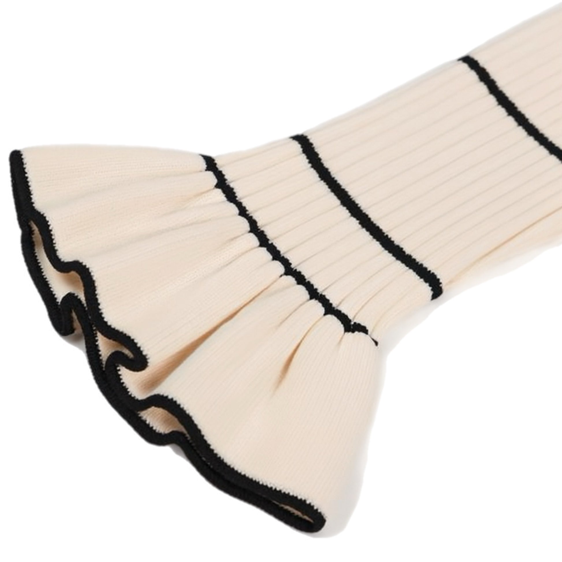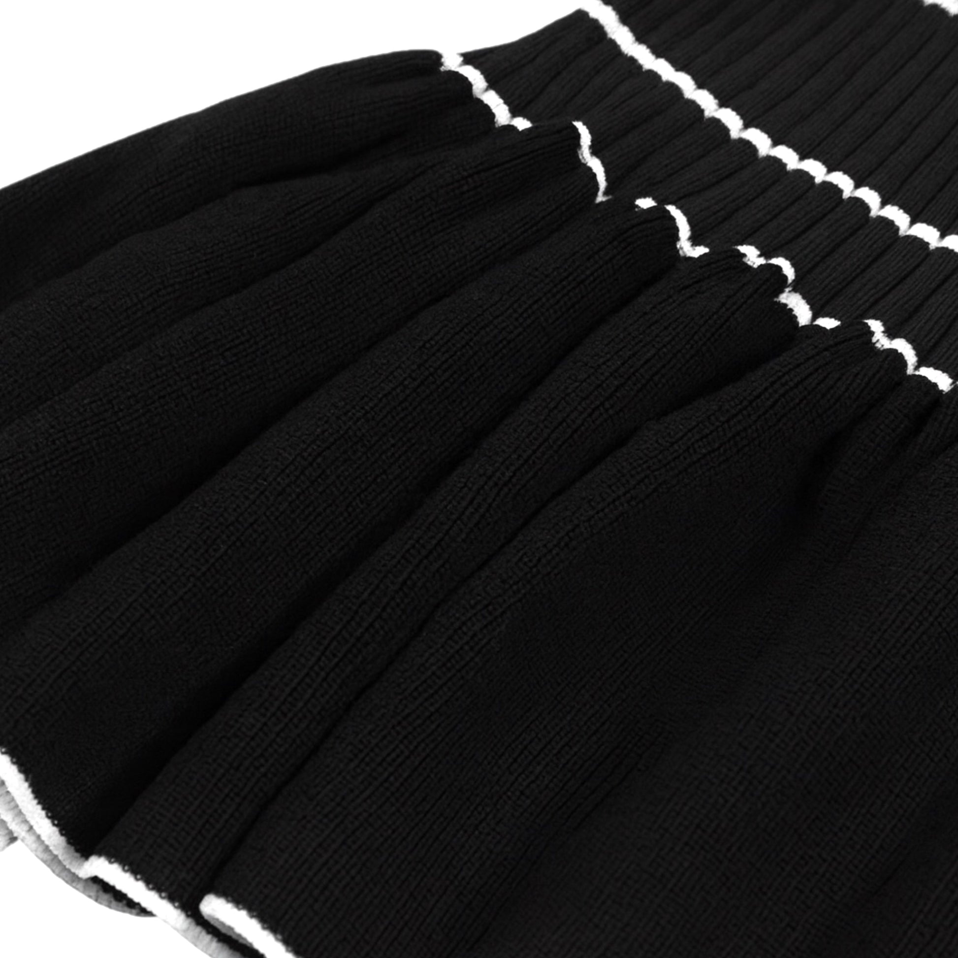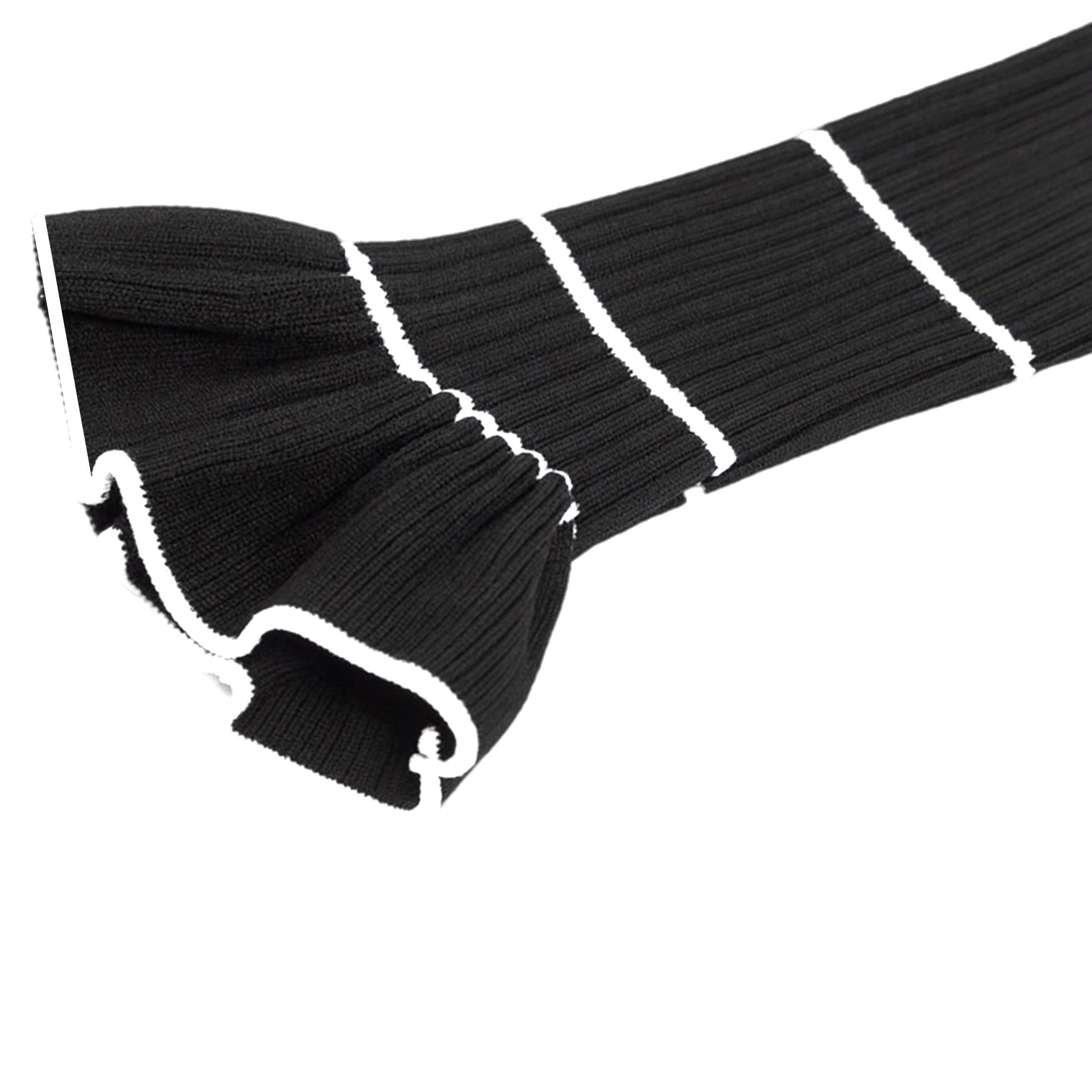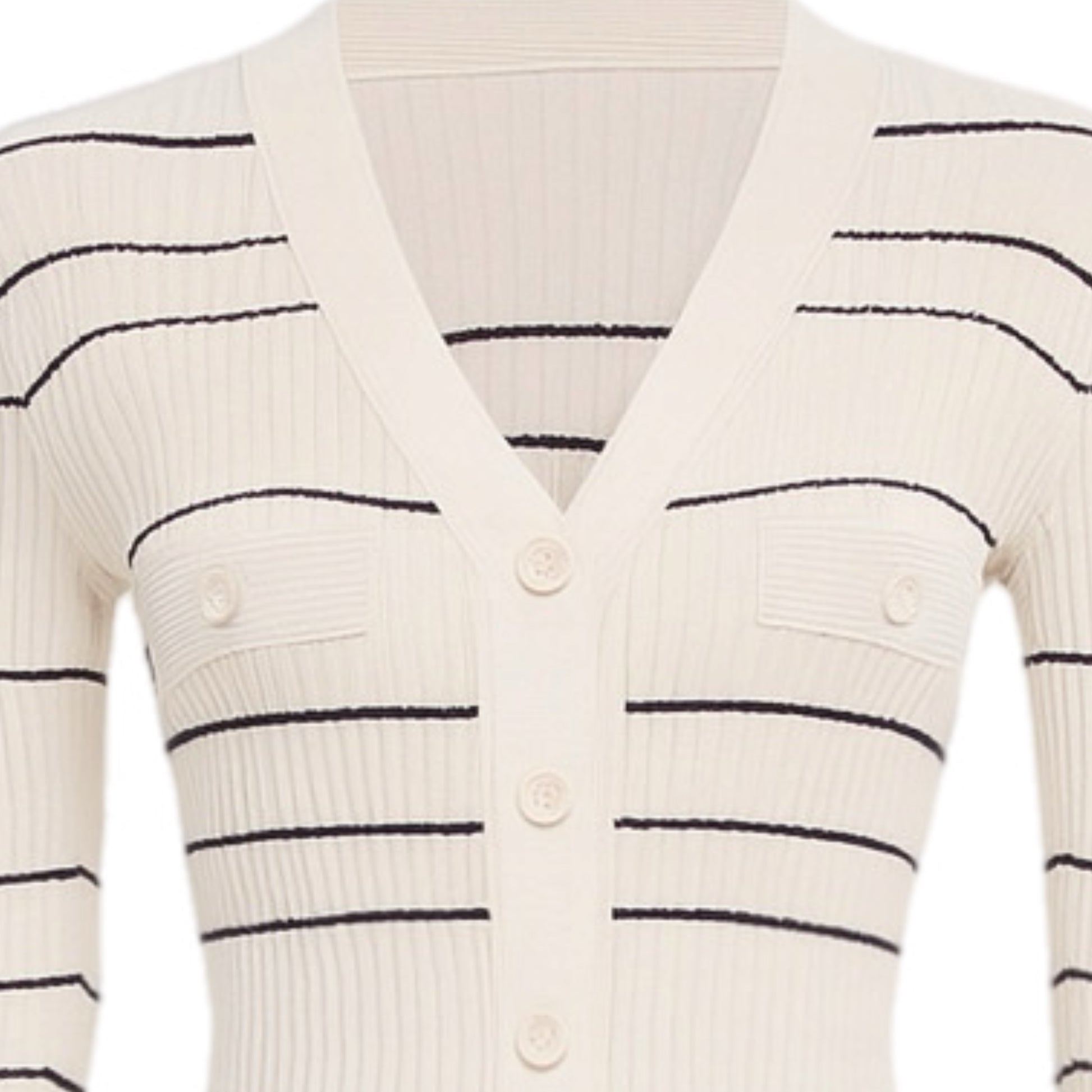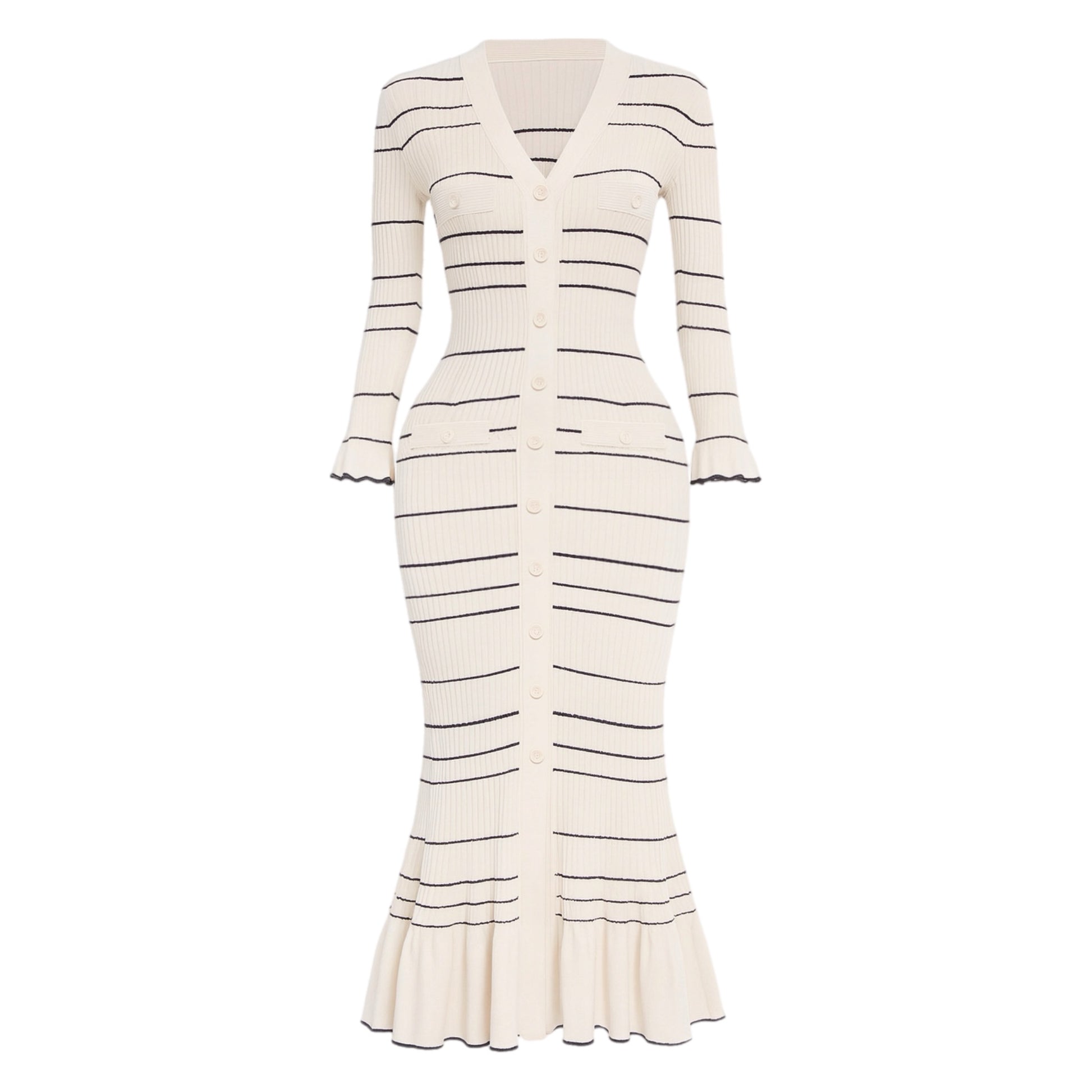 Affirmez votre style avec cette robe longue en maille tricotée à rayures graphiques noires et blanches. Sans manches et dotée d’un col V boutonné, elle combine confort et sophistication pour un look moderne et raffiné.