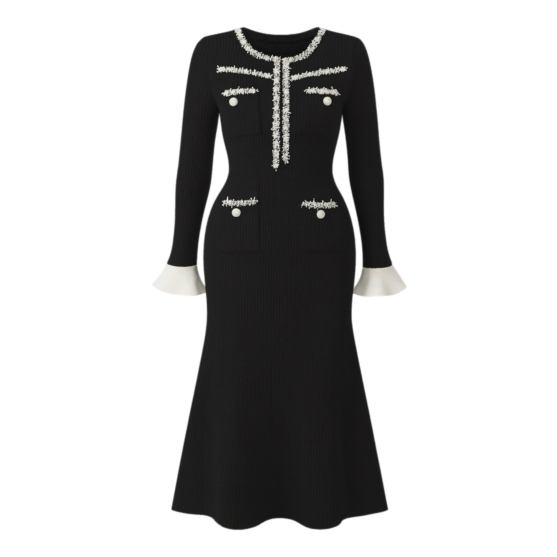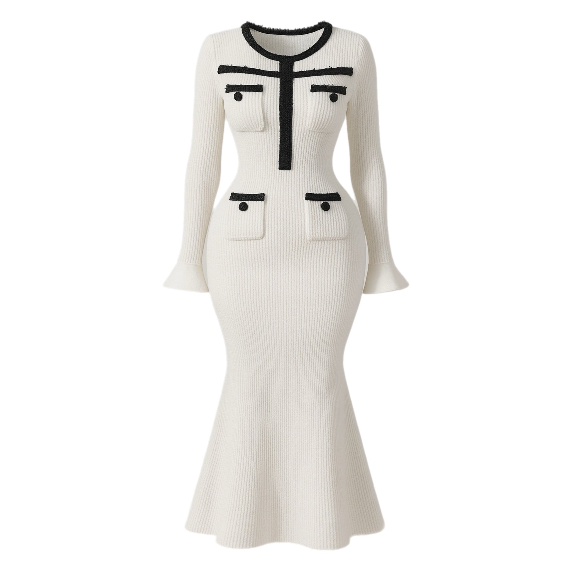 Cette robe longue luxueuse allie élégance et modernité grâce à son col rond et ses détails contrastés noirs. Cintrée à la taille pour sublimer la silhouette, elle se termine par une coupe queue de poisson qui ajoute une touche glamour. Parfaite pour des événements prestigieux ou des soirées d’automne.